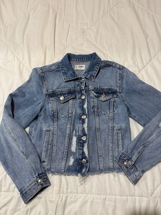Giacca in denim dal taglio moderno, perfetta per completare ogni outfit. - Design con bottoni. - Effetto used e strappi. - Orlo sfrangiato. - Un bottone si era rotto e l’ho sostituito.