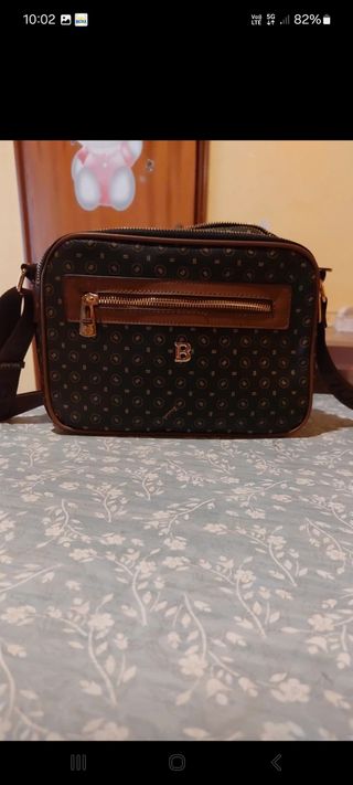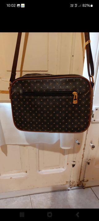 Borsa a tracolla con un design elegante e pratico. - Fantasia monogramma. - Dettagli in pelle marrone. - Chiusura con zip.