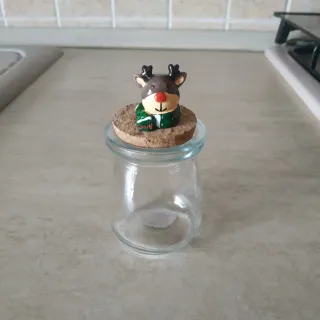 Carino barattolino a tema natalizio con una renna. - Tappo in sughero con decorazione a forma di renna. - Barattolo in vetro trasparente.