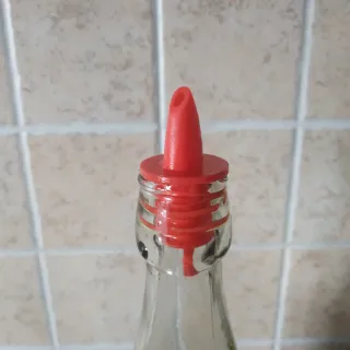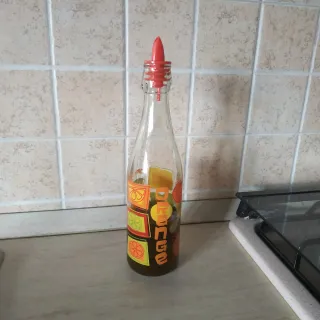 Elegante bottiglia in vetro per olio, perfetta per la tua cucina. Il tappo dosatore rosso permette un utilizzo preciso. - Design con decorazioni a tema agrumi. - Tappo in plastica rossa con beccuccio. Vendo bottiglia vuota, senza olio