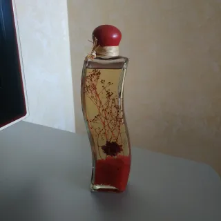 Elegante bottiglia decorativa che aggiunge un tocco di natura alla tua casa. Contiene fiori secchi - Fiori secchi rossi all'interno. - Tappo rosso sferico.