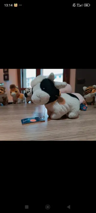 Peluche di mucca Trudi, un classico degli anni 2000. - Morbido tessuto marrone e bianco. - Dettagli ricamati sul muso.