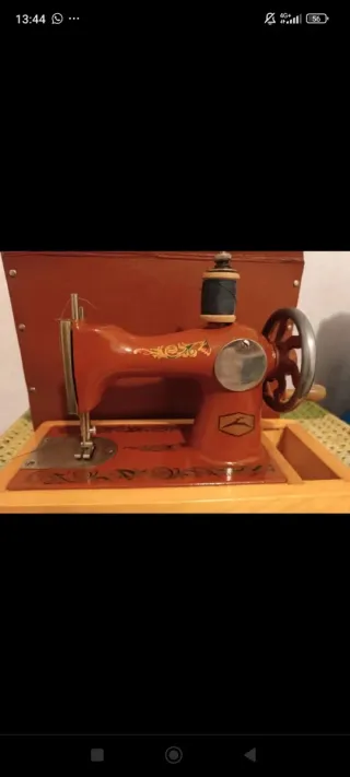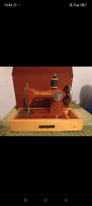 Macchina da cucire vintage, perfetta per collezionisti o come pezzo d'arredo. - Design retrò color rosso. - Base in legno chiaro. - Custodia in ecopelle marrone inclusa.