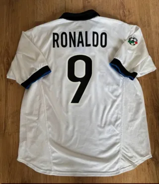 Maglia da trasferta dell'Inter indossata/preparata per Ronaldo nella stagione 1998/99. - Colore bianco con dettagli blu e neri. - Sponsor Pirelli. - Logo Nike e stemma dell'Inter.