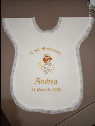Set battesimale personalizzato con ricamo. Il set comprende camicina, fazzoletto e su richiesta bavetto ( il prezzo varia ovviamente) - Il mio Battesimo - Nome: Andrea - Data: 31 Gennaio 2026 - Angioletto ricamato - Bordi in pizzo