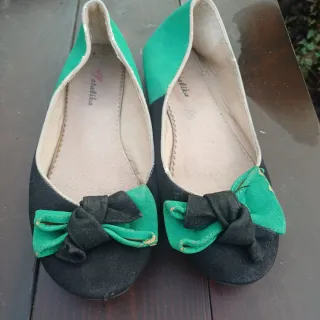 Elegantes bailarinas bicolores con un diseño llamativo. - Combinación de negro y verde vibrante. - Adorno de lazo en la punta. - Marca: Tatalika.