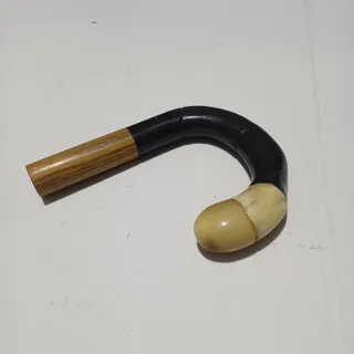 Manico artigianale realizzato in diversi materiali. - Parte superiore in legno. - Curva in materiale nero lucido. - Impugnatura in materiale beige chiaro.