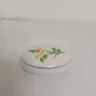 Elegante portagioie in porcellana Limoges, Francia. Presenta un delicato disegno di una rosa gialla con foglie verdi. - Finitura con bordo dorato. - Design ovale.