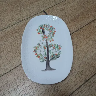 Elegante bandeja ovalada de la marca Hutschenreuther, fabricada en Alemania. Presenta un diseño pintado a mano de un árbol con flores blancas y frutos naranjas sobre un fondo blanco con relieve floral. 29x19 cm - Diseño pintado a mano. - Borde con relieve. - Ideal como pieza decorativa o para servir.