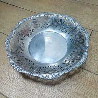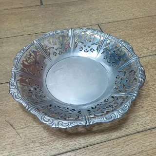 Elegante centro de mesa o vaciabolsillos fabricado en metal con un intrincado diseño calado. - Material: Metal. - Diseño: Calado con motivos florales y ornamentales. - Borde: Decorado con volutas.
