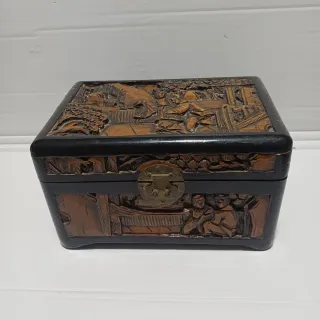 Elegante portagioie vintage realizzato in legno con intagli a mano. - Decorazioni raffiguranti scene di vita. - Chiusura metallica centrale. - Finitura in legno scuro e nero.