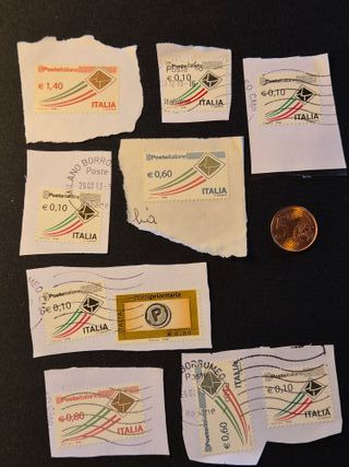 Lotto di 10 francobolli delle Poste Italiane. - Francobolli con diversi valori facciali. - Alcuni presentano date di emissione visibili. - Design con le tre bande tricolori italiane e simbolo Poste.