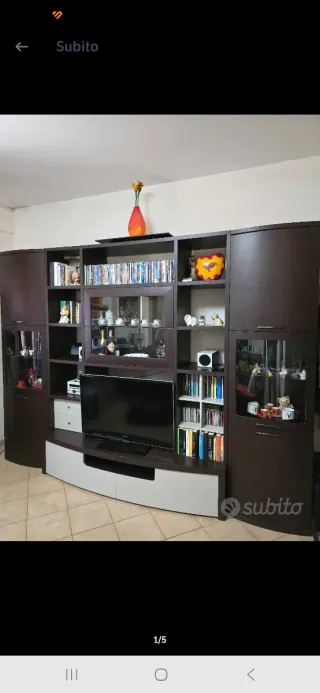 Parete attrezzata con finitura rovere scuro e dettagli in vetro. - Ampio spazio contenitivo. - Design moderno e funzionale. - Moduli componibili. Più divano 3 posti in omaggio . Smontaggio e trasporto a carico dell' acquirente.