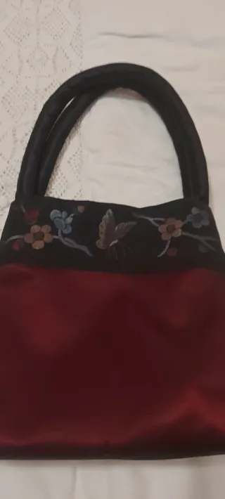 Elegante borsetta in seta con dettagli ricamati. - Motivo floreale e farfalla. - Manici neri intrecciati.