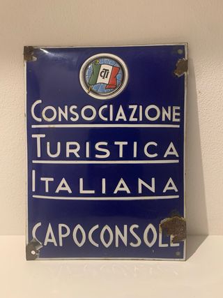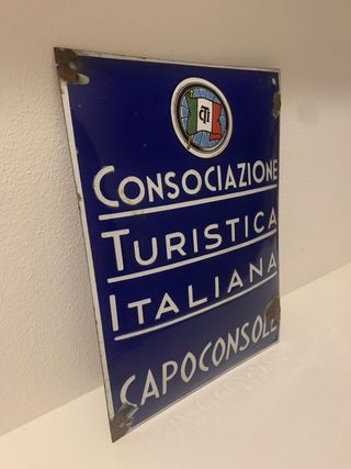 Rarissima insegna smaltata del Touring Club Italiano. Vintage anni’30/40. Molto rara in quanto nel 1937 il regime fascista diffonde la “Campagna di italianizzazione dei nomi stranieri” sostituendo la denominazione originale in “Consociazione Turistica Italiana” (perdurata negli anni del regime). Questa targa era esclusiva ed affissa nei pressi degli uffici del Capoconsole (rarità nella rarità). Misura 28x20cm. Bombata ed a rilievo. Minimi segni di vissuto ma in ottime condizioni estetiche come da foto. Articolo da museo!!! Insegna di notevole valore storico e collezionistico per seri appassionati del genere.