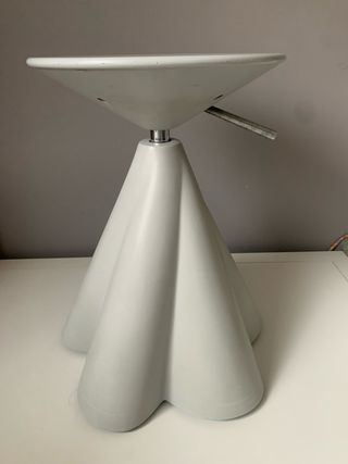 Raro e splendido sgabello design del celebre Philippe Starck per Presence Paris/Loreal. Vintage fine anni’80. È uno sgabello con seduta girevole e con ruote ed è adattabile in altezza tramite pistone a gas (perfettamente funzionante). Misura base 40x40cm. Misura seduta 33cm. Misura altezza minima 50cm. Misura altezza massima 78cm. Usato e con segni di vissuto come da foto ( da notare leggera sbeccatura nella parte inferiore della seduta) ma in condizioni accettabili. Fuori produzione. Articolo di rara reperibilità per seri amanti di complementi d’arredo di modernariato design.