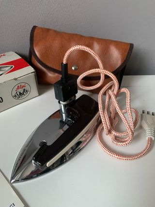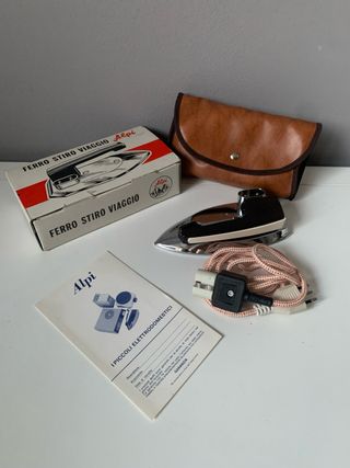 Favoloso ferro da stiro da viaggio Alpi. Vintage anni’60/70. Completo di custodia e scatola originale. Maniglia pieghevole salva spazio. Nuovo mai usato. Vendi come non testato per collezionisti o splendido oggetto decorativo d’arredo da vetrina.