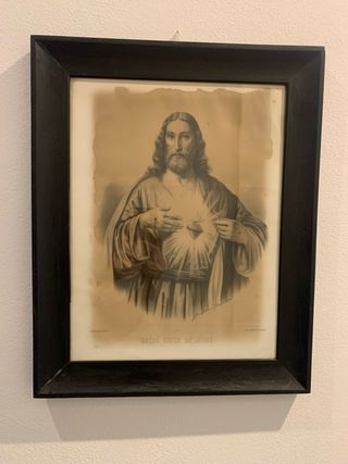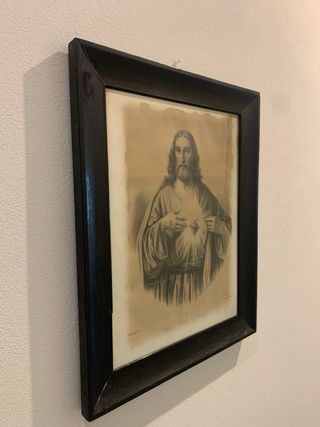 Meraviglioso quadro con stampa Sacro Cuore di Gesù. Antico dei primi del’900. Made in Francia. Stampata dalla rinomata Imp. Lemercier Paris edizione Eugène Jouy Editeur su disegno di Josephine Ducollet. Cornice in legno ebanizzato con frontale in vetro. Misura cornice 46x37cm. Vissuto ma dalla patina del tempo stupenda e molto decorativa (cornice non restaurata ma con gancio nuovo per appendere e vetro con piccoli difetti del tempo). Articolo storico molto decorativo per amanti ed appassionati del genere.