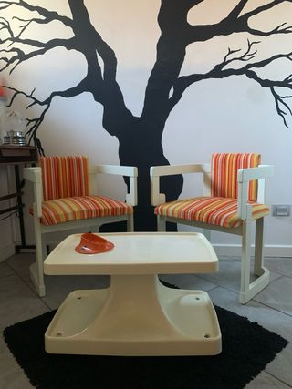 Meraviglioso tavolino da caffe Space Age. Vintage anni’60/70. Materiale plastica. Girevole con ruote in metallo originali. Misura 63x39x37cm. Usato e con segni di vissuto ma senza rotture ed in condizioni piu che accettabili. Articolo di non facile reperibilita per seri amanti di complementi d’arredo vintage.
