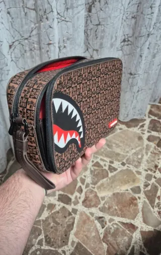 Pochette Sprayground con un design unico. - Fantasia con logo ripetuto. - Dettaglio stampa squalo. - Interno rosso.