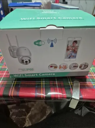 Telecamera di sorveglianza WiFi Smart Camera, ideale per monitorare i tuoi spazi. - Design bianco moderno. - Adatta per uso esterno (IP66). - Include alimentatore e kit di montaggio.