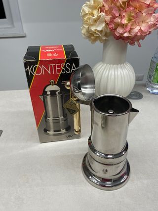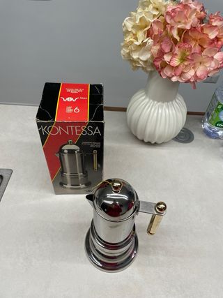 Macchina per caffè espresso in acciaio inossidabile, modello Kontessa. - Design elegante con finiture in acciaio. - Manico oro 24k per un tocco di stile. - Ideale per preparare un ottimo caffè. - Marca: VEV.