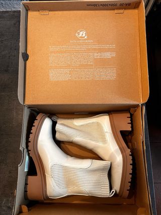 Stivaletti alla caviglia con un design moderno e versatile. - Tomaia in ecopelle bianca. - Inserti laterali elasticizzati a costine. - Suola carrarmato in gomma marrone. - Tacco largo e robusto.