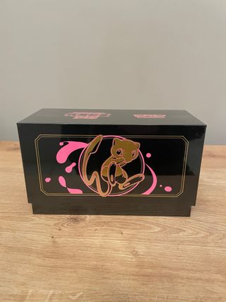 Box da collezione a tema Mew Radiant, edizione cinese. - Design nero con dettagli oro e rosa. - Raffigurazione di Mew al centro.