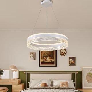 Elegante lampada a sospensione dal design moderno, perfetta per illuminare qualsiasi ambiente. - Struttura circolare con doppio anello. - Dettagli in cristallo scintillante. - Finitura bianca e trasparente. Lampada a sospensione a LED moderna, lampadari rotondi dimmerabili con telecomando, lampada a sospensione in acrilico a 3 colori per soggiorno sala da pranzo camera da letto D20in/50cm bianco