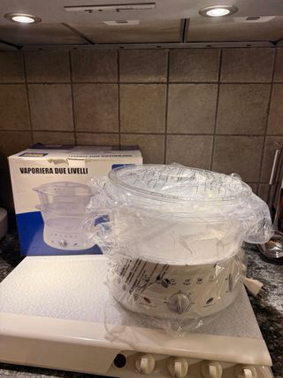 Vaporiera elettrica a due livelli, ideale per cucinare in modo sano e veloce. - Due cestelli trasparenti per la cottura. - Serbatoio dell'acqua visibile. - Pannello di controllo con timer.