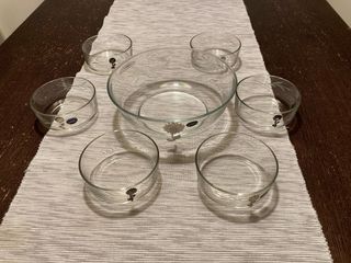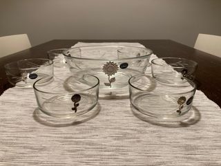 Elegante set di ciotole in vetro con decorazione floreale. - Design vintage. - Decorazione a tema floreale. - Ciotola centrale più grande e sei ciotole più piccole.