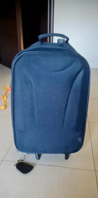 Vendo trolley da cabina blu navy morbido in poliestere resistente, dimensioni compatte per bagaglio a mano (ca. 55x35x20 cm), usato ma in ottime condizioni generali. 4 ruote 360° fluide, manico telescopico regolabile, maniglia superiore, zip sicure e scomparti interni per organizzazione. Ideale per voli low-cost, viaggi brevi o come bagaglio extra; leggero e maneggevole. Piccole tracce d'uso normali