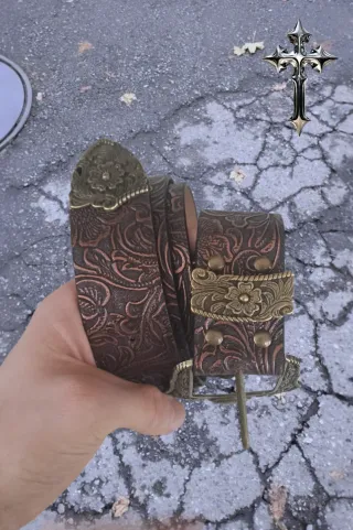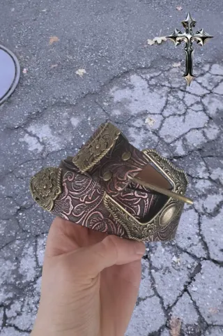 Cintura super particolare in stile vintage/western con lavorazione incisa effetto floreale su tutta la superficie. Colore marrone scuro con sfumature ramate che creano un bellissimo effetto vissuto 🔥 Fibbia grande color ottone con decorazioni floreali in rilievo, davvero d’impatto. Materiale sintetico effetto pelle, strutturato e resistente. Perfetta per dare carattere anche all’outfit più semplice: basta abbinarla a jeans a vita bassa, pantaloni cargo, maxi skirt o mini skirt per un look deciso e alternativo. Stile: western, gotico, Y2K, boho, country, rock, biker, streetwear, grunge, aesthetic 🤎✨ Ideale per chi ama accessori sta