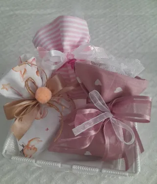 Set di sacchettini portaconfetti, ideali per bomboniere. - Tessuto con fantasia di coniglietti e stelle. - Decorati con nastri in raso e spago. - Pompon color pesca. - Tessuto a righe rosa e bianche. - Tessuto rosa con cuoricini bianchi. - Fiocchi in raso bianco e rosa.minimo acquisto 10pz