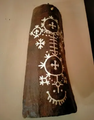 Tegola in terracotta decorata a mano con simboli Rune di protezione - Decorazione con vernice bianca. - Motivi circolari con croci e stelle. - Simboli stilizzati nella parte inferiore.