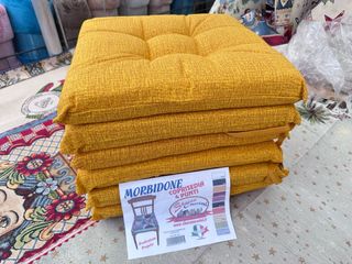 Cuscini Sedia 6 Pezzi (Nuovo Mai Usato) Modello Imbottito Trapuntato al centro per rendere l'imbottitura più stabile. Misura di ogni singolo cuscino 40x40 cm Colore Giallo Dotato di due lacci dietro per poter essere legato alla sedia. per informazioni o richieste scrivere pure. possibilità su più quantità di articoli di avere lo sconto
