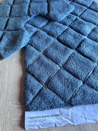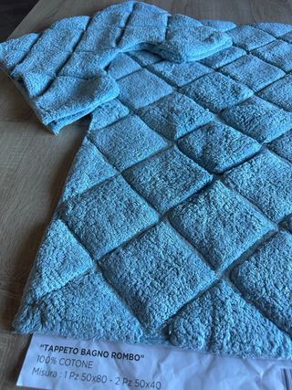 Tappeto Bagno 3 Pezzi Rombo (Nuovo Mai Usato) Tappeto In Spugna Composizione 100% Puro Cotone Composizione Set 3 Pezzi Uno Rettangolare 50x80 cm Due Giro Water 50x40 cm Colore Azzurro Fantasia Rombo Tappeto Bagno in Spugna Di Buona Qualità Morbida & Consistente Colori Compatti Con Ottima Lavorazione. Per informazioni Scrivere Pure