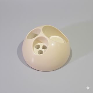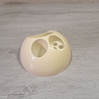 iconico organizer da bagno prodotto da Gedy (Made in Italy) su disegno del celebre designer giapponese Makio Hasuike. Un vero esempio di design italiano anni ’70, molto ricercato da collezionisti e amanti dello stile modernista. L’oggetto è realizzato in plastica rigida di colore avorio/crema, con forma tondeggiante e scomparti integrati. La base riporta chiaramente il marchio: “made in Italy by Gedy – design. MAKIO HASUIKE”. Caratteristiche Materiale: plastica dura di alta qualità, tipica della produzione Gedy anni ’70. Colore: crema / avorio. Diametro: circa 18 cm Scomparti di diverse dimensioni per spazzole, pettini, cosmeti