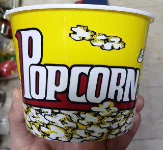 Contenitore per popcorn con un design vivace e allegro. - Motivo a pois e chicchi di mais. - Bordo superiore bianco.