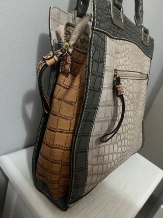Elegante borsa Guess con un raffinato effetto coccodrillo che combina tonalità beige e grigie. Un accessorio distintivo per ogni occasione. - Design con pannelli a contrasto. - Dettagli metallici dorati. - Manici superiori. - Chiusura con fibbia decorativa.