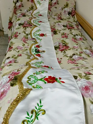 Elegante tovaglia con ricami floreali e una figura sacra. Santa Lucia - Ricamo centrale di una figura con aureola e palma. - Bordi decorati con fiori rossi e passamaneria dorata. - Tessuto bianco in raso. - Motivo floreale sul bordo inferiore.