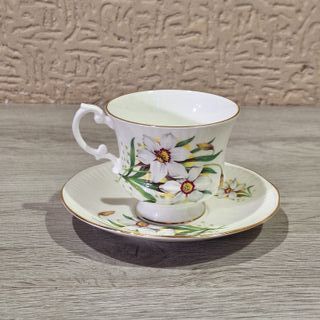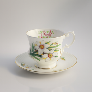 Elegante tazza da tè con relativo piattino in fine bone china inglese, marchiata Elizabethan – Staffordshire (England), decorata a mano. La tazza riporta all’interno la scritta “March”, con delicata decorazione floreale primaverile. All’esterno e sul piattino sono presenti fiori bianchi (narcisi) con foglie verdi, impreziositi da bordino dorato sul bordo della tazza e del piattino. Manico sagomato in stile classico. Dimensioni (circa): Diametro piattino: ~14,5 cm Altezza tazza: ~7,5 cm Nessuna crepa o sbeccatura