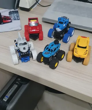 Set di 5 monster truck giocattolo. Auto che spingendole camminano sole e si rimettono in piedi a 2euro l uno - auto rossi, blu e gialli. - Ruote grandi e resistenti. - Design a tema animale (squalo, tigre). - Ideali per il gioco.