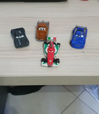 Set di 4 macchinine del film Cars della Disney. Unico difetto carro attrezzi con gancio modificato come si vede nell ultima foto - Personaggi iconici del film. - Ideali per collezionisti e appassionati.