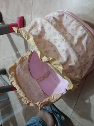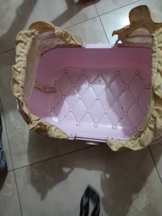 Culletta per bambola in plastica rosa, con rifiniture in tessuto. - Interno trapuntato. - Tessuto esterno con volant.