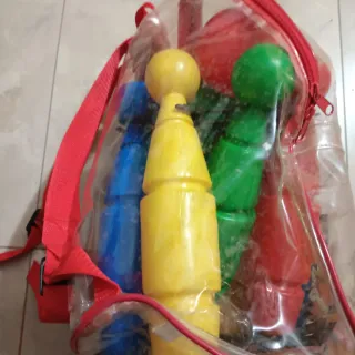 Set di birilli in plastica con personaggio Disney. - Birilli colorati. - Borsa trasparente con stampa di Goofy. - Manico per il trasporto.
