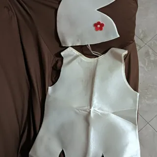 Set composto da due pezzi per un costume da Puffetta. - Include un cappello decorato con un fiorellino rosso. - Il secondo pezzo è un corpetto senza maniche.