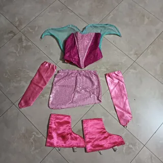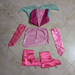 Completo per travestimento da Winks, taglia 2/3 anni. Include tutti gli accessori per un look completo. - Corpetto rosa con paillettes e ali azzurre. - Gonna rosa con paillettes. - Scaldamuscoli rosa. - Stivali rosa.