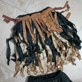 Set composto da top e gonna per ballo, taglia 6 anni. - Top con frange color cuoio, nero e beige. - Gonna con frange in diverse tonalità e dettagli dorati.