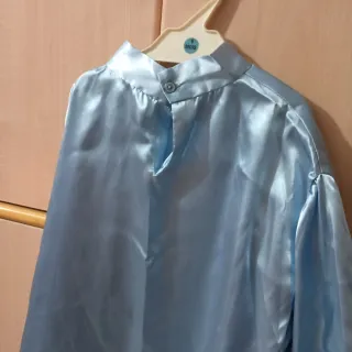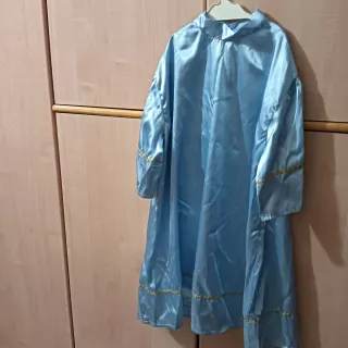 Bellissimo vestito da angioletto azzurro, perfetto per feste o recite. - Taglia 4/5 anni. - Tessuto satinato lucido. - Dettagli dorati sulle maniche e sul fondo.